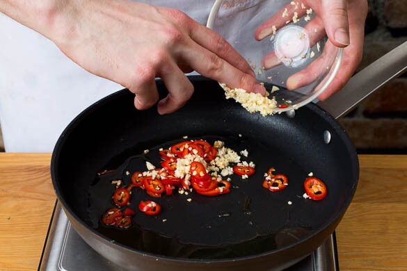 Die ½ der Peperoni und die Knoblauch-Ingwer-Paste in dem Wok bzw. der Pfanne mit dem Sesamöl bei mittlerer Hitze ca. 1Min. anbraten. Tipp: Wer es gerne scharf mag, kann mehr Peperoni verwenden. Den Pak Choi untermengen und mit je 1 Prise Salz und Pfeffer würzen.