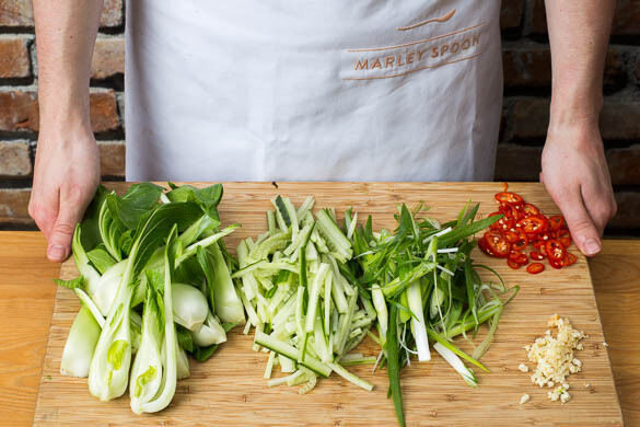 Mit einem Wasserkocher 1L Wasser für den Pak Choi zum Kochen bringen. Den Pak Choi längs vierteln. Die Gurke quer halbieren und in dünne Stifte schneiden. Die Lauchzwiebeln sehr schräg in dünne Ringe schneiden. Die Peperoni in dünne Scheiben schneiden. Tipp: Wer es weniger scharf mag, entfernt vorher die Kerne.