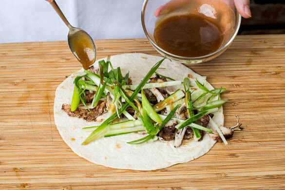 Heute gibt’s wieder mal eine echte Crossover-Leckerei, bei deren bloßem Anblick uns schon das Wasser im Munde zusammenläuft: Saftiges, bereits mariniertes Hähnchenfleisch, frische Gurke und Lauchzwiebeln, feurige Peperoni, würzige Hoisinsauce und eleganter Pak Choi erinnern an das ferne Asien – serviert wird das Ganze allerdings als Wrap in mexikanischen Tortillas. Schön, dass die Welt kulinarisch immer näher zusammenrückt!