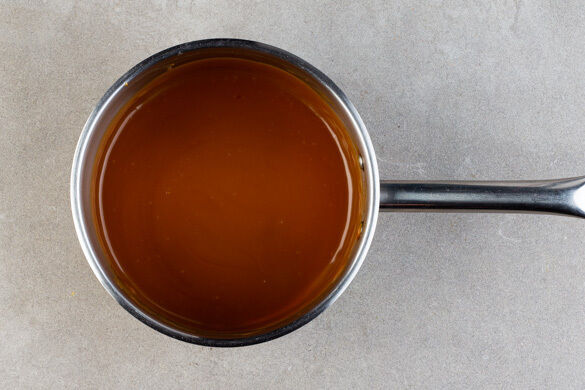 Einen kleinen Topf mittel bis stark erhitzen. Die ½ des restlichen Zuckers und 40ml Wasser in den Topf geben und ohne Rühren aufkochen lassen, den Topf ggf. leicht hin und her schwenken. Vorsicht, der Zucker wird sehr heiß! Sobald sich der Zucker aufgelöst hat und anfängt, goldbraun zu werden, sofort den Topf vom Herd nehmen.