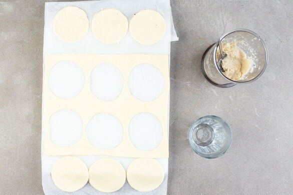 Den Teig samt Papier auf einem Backblech ausrollen. Mit einem Glas oder einer Plätzchenform 6 Kreise von ca. 8cm Durchmesser ausstechen und die Mandelcreme darauf verstreichen. Jeweils 3 Teigkreise übereinanderstapeln und die 2 Törtchen neben den Birnen im Ofen in 15–17Min. knusprig backen, dabei darauf achten, dass die Mandelcreme nicht verbrennt.