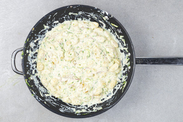 Den Zucchini-Gnocchi-Mix mit Salz und Pfeffer abschmecken, dann die Zitronenschale und die Crème fraîche zugeben und die Sauce 1–2Min. sanft köcheln lassen. Ggf. etwas Wasser hinzufügen, bis alles gleichmäßig mit der Sauce bedeckt ist.