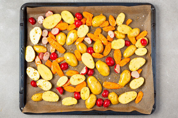Den Backofen auf 230°C (210°C Umluft) vorheizen. Die Kartoffeln je nach Größe halbieren oder vierteln. Die Radieschen halbieren. Die Karotte ggf. schälen und schräg in Scheiben schneiden.