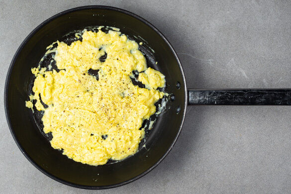 Die Eier in der Pfanne bei mittlerer Hitze 1–2Min. stocken lassen. Den Käse und je 1 Prise Salz und Pfeffer untermengen und das Rührei abgedeckt bei niedriger Hitze weitere 2–3Min. garen, bis der Käse geschmolzen ist. Vom Herd nehmen und einmal grob durchrühren.