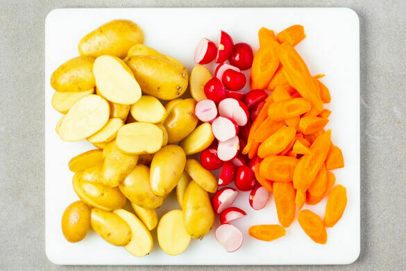 Den Backofen auf 230°C (210°C Umluft) vorheizen. Die Kartoffeln je nach Größe halbieren oder vierteln. Die Radieschen halbieren. Die Karotten ggf. schälen und schräg in Scheiben schneiden.