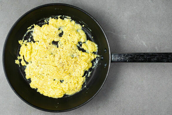 Die Eier in der Pfanne bei mittlerer Hitze 1–2Min. stocken lassen. Den Käse und je 1 kräftige Prise Salz und Pfeffer untermengen und das Rührei abgedeckt bei niedriger Hitze weitere 2–3Min. garen, bis der Käse geschmolzen ist. Vom Herd nehmen und einmal grob durchrühren.