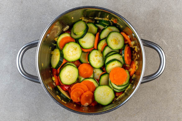Das Brühgewürz und das heiße Wasser aus dem Wasserkocher in den Topf geben und gut rühren, damit sich das Gemüse vom Topfboden löst.