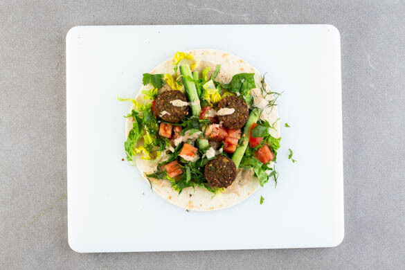 Die Tortillas mit je 1–2TL Tahinisauce bestreichen und nach Belieben die Falafeln, einige Gurken, etwas Salat und die Salsa darauf anrichten. Zu Wraps zusammenfalten. Die übrigen Gurken in mundgerechte Stücke schneiden, mit dem restlichen Salat, 1–2TL Zitronensaft, 1EL Olivenöl und je 1 kräftigen Prise Salz und Pfeffer vermengen und als Beilage servieren.