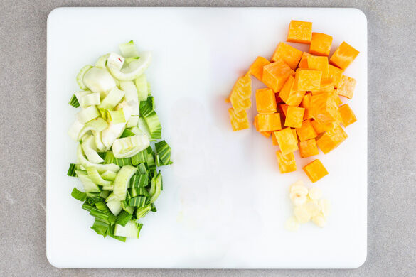 Den Pak Choi der Länge nach halbieren und quer in ca. 2cm breite Streifen schneiden. Die Süßkartoffeln schälen und in 1–2cm große Würfel schneiden. Den Knoblauch schälen und in feine Scheibchen schneiden.