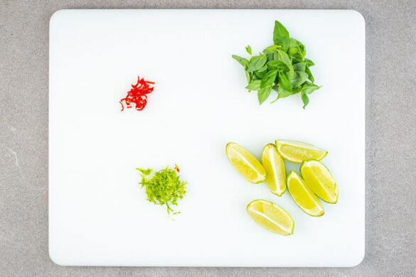 Die Limettenschalen fein abreiben und jede Limette in 6 Spalten schneiden. Die Chilischoten längs halbieren und in hauchdünne Streifen schneiden. Tipp: Für weniger Schärfe die Kerne entfernen. Die Thai-Basilikumblätter von den Stängeln zupfen.