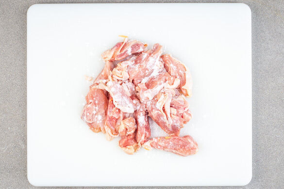 Das Fleisch trocken tupfen, in 1–2cm dünne Streifen schneiden und mit 1 kräftigen Prise Salz würzen. Anschließend in 1EL Speisestärke wenden, überschüssige Stärke leicht abklopfen.