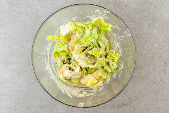 Den Salat vom Strunk befreien und in ca. 2cm breite Streifen schneiden, dann mit dem Dressing vermengen.