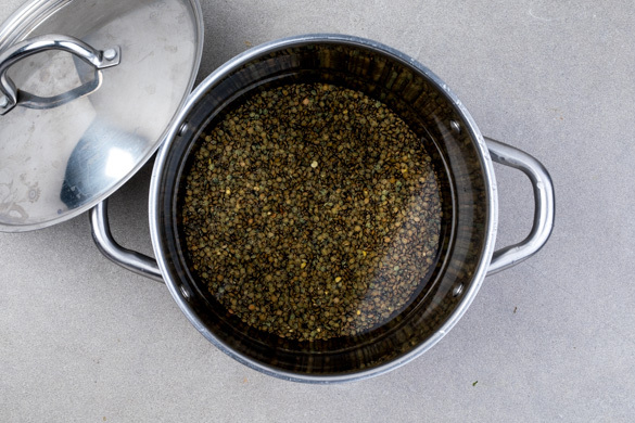 Die Linsen in einem Sieb mit kaltem Wasser abspülen und abtropfen lassen. Die übrige Zwiebelhälfte fein würfeln und mit 1 Prise Salz in einem mittelgroßen Topf mit 1EL Olivenöl bei mittlerer Hitze 2–3Min. glasig anbraten. Die Linsen mit 1–2EL Wasser zugeben und bei niedriger bis mittlerer Hitze 5–10Min. erwärmen, bis die Flüssigkeit verdampft ist, dabei gelegentlich umrühren.