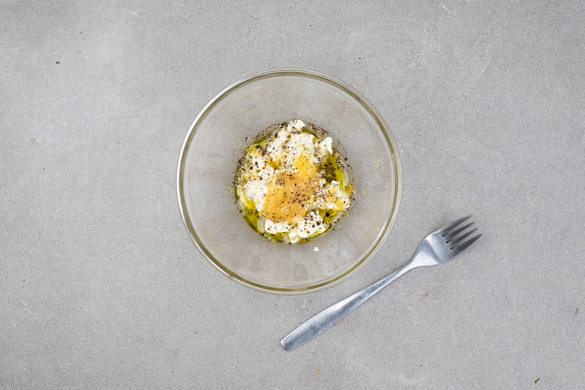 Die ½ des Fetas mit 1TL Honig, der Zitronenschale, 1–2EL Zitronensaft, 1EL Olivenöl sowie je 1 Prise Salz und Pfeffer zu einem cremigen Dressing verrühren. Die Petersilie, ca. ⅔ der Minze und die Peperoni nach Geschmack untermischen.