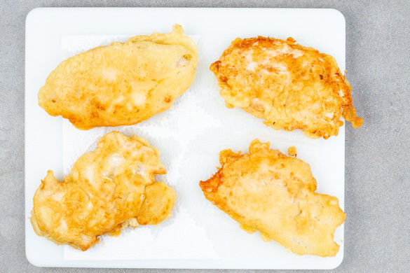 200ml kaltes Wasser mit 2TL Backpulver und 160g Mehl verrühren und den Teig mit je 1 kräftigen Prise Salz und Pfeffer würzen. Tipp: Wer den Messbecher sparen möchte, kann auch 200g Wasser abwiegen. Für das Dressing die Crème fraîche mit der Zitronenschale, dem Zitronensaft, 2EL Mayonnaise und 2EL Senf verrühren.