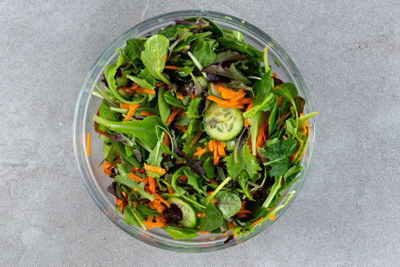 Den Salat ggf. verlesen. 2EL Olivenöl und 2EL Essig mit 2EL Wasser und 1TL Senf verrühren und das Dressing mit Salz, Pfeffer und Zucker abschmecken.