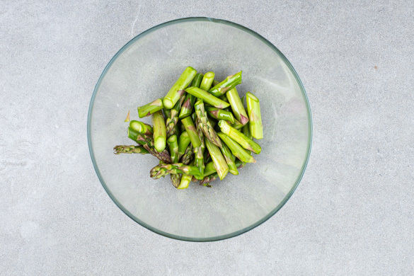 Die Backbleche mit dem Backofen auf 220°C (200°C Umluft) vorheizen. Den Spargel am unteren Drittel schälen und schräg in 2–3cm lange Stücke schneiden.