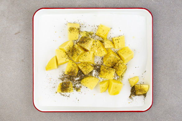 Den Backofen auf 200°C Umluft (220°C Ober-/Unterhitze) vorheizen. Die Kartoffeln schälen und in 1–2cm große Stücke schneiden. Auf einem mit Backpapier ausgelegten Backblech mit 1EL Olivenöl, 1EL Gewürzmischung und 1/2TL Salz vermengen und 15–20Min. rösten, bis die Kartoffeln knusprig und goldbraun sind.