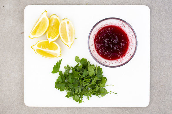 Die Petersilienblätter samt Stängeln grob hacken. Die Zitrone halbieren und in Spalten schneiden. Die Marmelade mit 1EL Wasser verrühren. Die Kartoffeln mit der Zitronenbutter und der Petersilie vermengen. Die Schnitzel mit den Kartoffeln anrichten und mit Marmelade und den Zitronenspalten servieren.