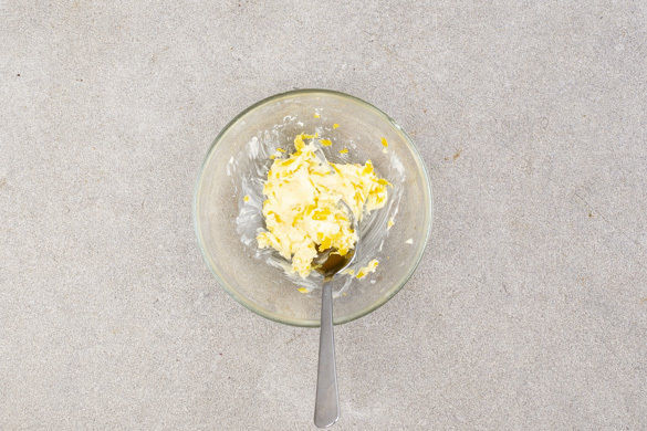 Ca. 1/2TL Zitronenschale abreiben und mit 1–2TL zimmerwarmer Butter und 1 Prise Salz vermengen.