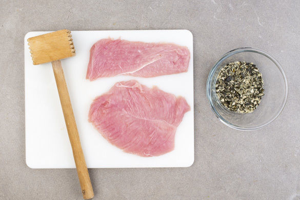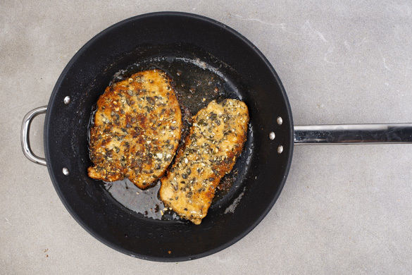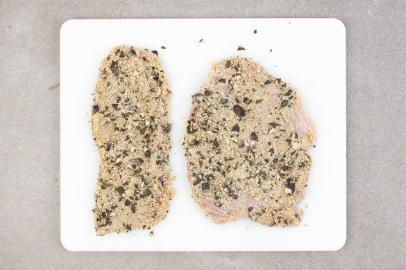 Das Fleisch mit etwas Küchenkrepp trocken tupfen und zwischen Frischhaltefolie flach klopfen. Falls die Fleischstücke sehr dick sein sollten, diese zuvor mit einem Messer horizontal auf-, aber nicht durchschneiden, aufklappen und dann flach klopfen. Die Kürbiskerne fein hacken oder in eine Plastiktüte geben und klein klopfen.