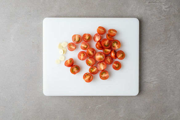 Die Kirschtomaten halbieren. Den Knoblauch schälen und in feine Scheibchen schneiden.