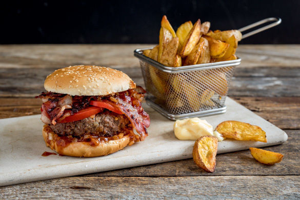 Kann es denn noch besser kommen? Bacon und Burger! Wir sagen es noch mal: Bacon und Burger! Dazu gibt es eine süßlich-würzige BBQ-Zwiebel-Sauce und pikante Kartoffelwedges. Legt die Servietten bereit und los geht’s!
