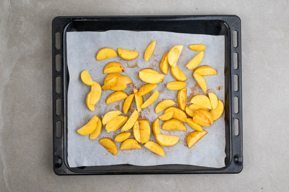 Den Backofen auf 200°C Umluft (220°C Ober-/Unterhitze) vorheizen. Die Kartoffeln samt Schale in ca. 2cm dicke Spalten schneiden und mit 1–2EL Olivenöl sowie Salz und der Gewürzmischung nach Geschmack vermengen. Auf einem mit Backpapier ausgelegten Backblech verteilen und im Ofen 20–25Min. rösten, bis die Kartoffeln goldbraun und gar sind. Nach der Hälfte der Zeit einmal wenden.