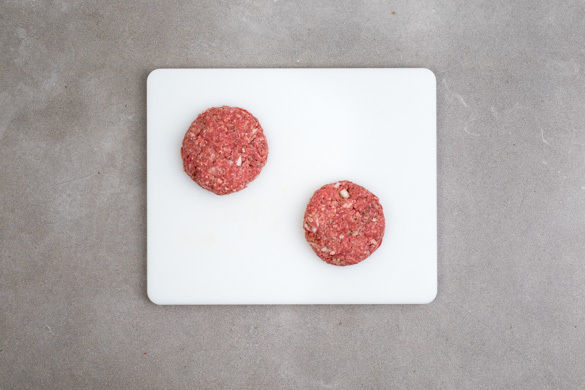 Die restlichen Zwiebeln mit dem Hackfleisch vermengen und die Hackfleischmasse mit Salz und Pfeffer würzen. Das Fleisch zu 2 gleich großen Pattys formen, dabei die Mitte etwas eindrücken. Die Pfanne erneut erhitzen und die Pattys darin 1–2Min. pro Seite anbraten. Anschließend im Ofen in 8–10Min. fertig garen. Wer keine ofenfeste Pfanne hat, kann eine Auflaufform verwenden.