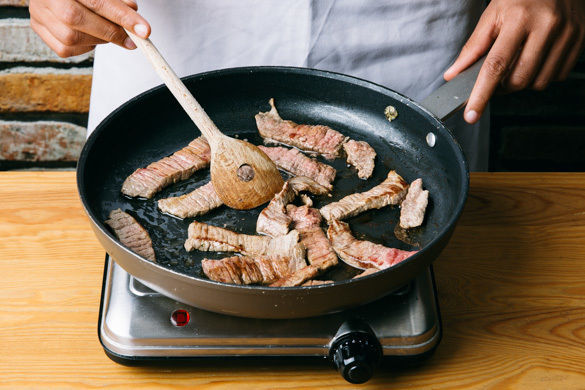 Das Fleisch in einer mittelgroßen Pfanne mit 1EL Pflanzenöl bei starker Hitze 1–2Min. scharf anbraten, dann sofort aus der Pfanne nehmen und mit Salz würzen. Die Lauchzwiebeln in die Suppe geben und 2–3Min. bei sehr geringer Hitze ziehen lassen.