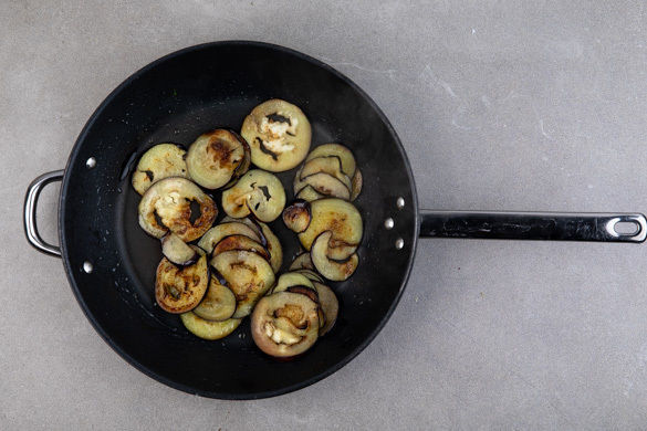 Die Aubergine in ca. 0,5cm dünne Scheiben schneiden, diese leicht salzen und in einer zweiten großen Pfanne mit 1–2EL Olivenöl bei mittlerer bis starker Hitze auf jeder Seite 1–2Min. goldbraun anbraten.