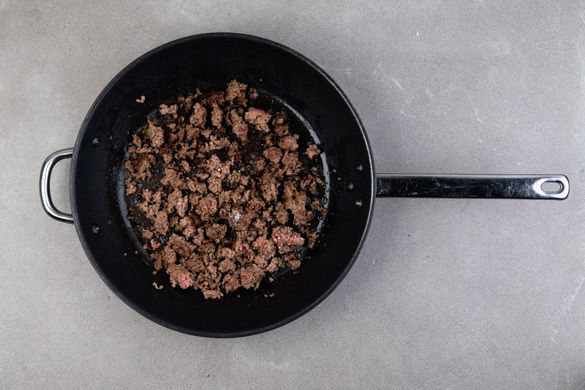 Das Hackfleisch in einer großen Pfanne mit 1–2EL Olivenöl bei starker Hitze 3–4Min. krümelig anbraten. Mit Salz und Pfeffer würzen.