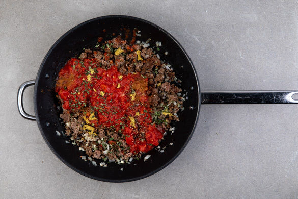 Die Zwiebeln und den Knoblauch zum Hackfleisch in die Pfanne geben und 2–3Min. bei mittlerer Hitze mitbraten. Mit den gehackten Tomaten ablöschen, das Brühgewürz unterrühren und die Sauce 4–5Min. sanft köcheln lassen. Den Majoran unterrühren und nach Geschmack mit dem Zimt sowie Salz und Pfeffer würzen.