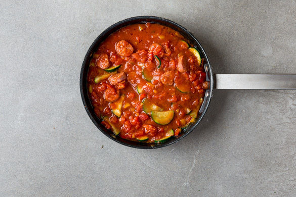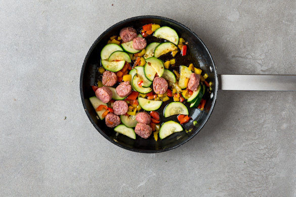Die Paprika halbieren, entkernen und in kleine Würfel schneiden. Die Zucchini längs halbieren und in dünne Scheiben schneiden. Das Gemüse zur Salsiccia in die Pfanne geben und 3–4Min. mitbraten, dann mit der Gewürzmischung nach Geschmack würzen.