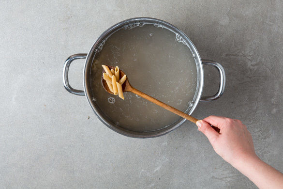 In einem großen Topf ausreichend gesalzenes Wasser für die Pasta zum Kochen bringen. Die Pasta in das kochende Wasser geben und in 7–9Min. bissfest kochen. Mit einer Tasse etwas Pastawasser abschöpfen, dann in ein Sieb abgießen und abtropfen lassen.