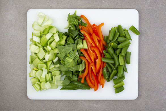 Den Pak Choi am Strunk dünn abschneiden. Die grünen Blätter und den weißen Strunk getrennt in ca. 1cm breite Streifen schneiden. Die Paprika vierteln, entkernen und in ca. 0,5cm dünne Streifen schneiden.