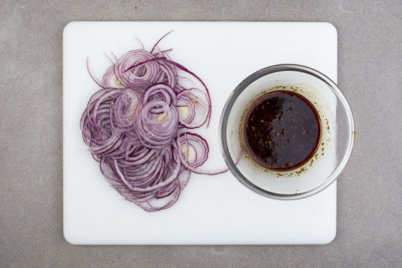In einem Wasserkocher 1L Wasser für die Nudeln zum Kochen bringen. Den Ingwer und den Knoblauch schälen und fein würfeln, dann mit der Teriyakisauce, 1EL Pflanzenöl, 1EL Essig sowie Salz und Pfeffer verrühren. Die Zwiebel schälen, halbieren und in feine Streifen schneiden.
