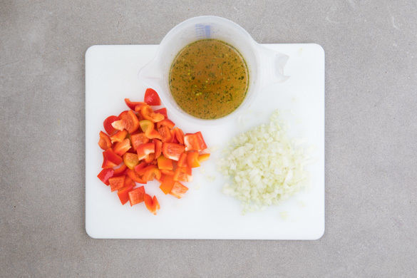 Den Backofen auf 180°C Umluft (200°C Ober-/Unterhitze) vorheizen. Die Paprika halbieren, entkernen und in ca. 1cm große Würfel schneiden. Die Zwiebel schälen, halbieren und in feine Würfel schneiden. Das Brühgewürz in 600ml heißem Wasser auflösen.