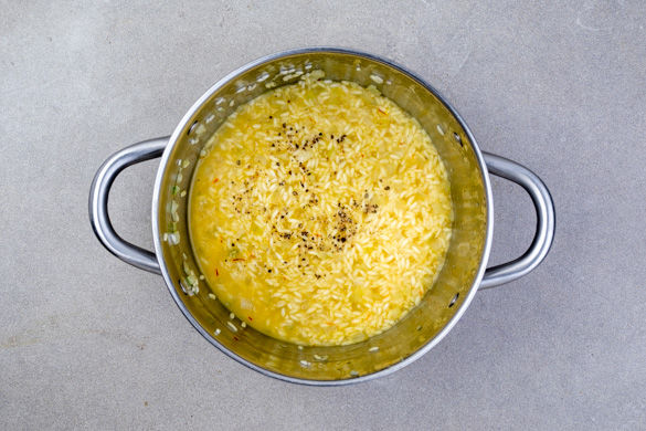 Den Reis in den Topf geben und 1–2Min. mitbraten. Nach und nach unter Rühren die Brühe zugeben und einköcheln lassen, bis die gesamte Flüssigkeit aufgebraucht ist, das dauert 18–20Min. Das Risotto sollte sämig sein, der Reis aber noch Biss haben. Kräftig mit Salz und Pfeffer abschmecken.