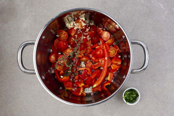 Die Paprika und die Zwiebeln in einem mittelgroßen Topf mit 1–2EL Olivenöl bei mittlerer Hitze 4–5Min. anbraten. Die Tomaten, den Knoblauch, die Chilihälfte, die 1/2 der Gewürzmischung und 1 Thymianstängel hinzugeben und alles ca. 10Min. köcheln lassen. Die 1/2 der Korianderblätter fein schneiden, die Stängel in der Suppe mitkochen.