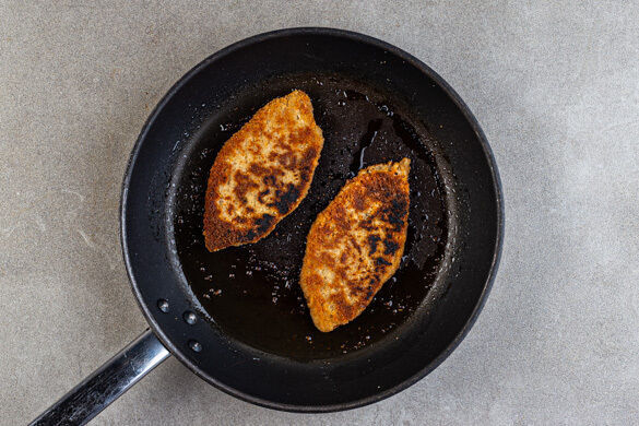 Die Bohnenschnitzel in einer mittelgroßen Pfanne mit 1EL Pflanzenöl bei mittlerer bis starker Hitze 3–4Min. auf jeder Seite goldbraun und knusprig braten. Je nach Größe der Pfanne ggf. eine größere oder eine zweite Pfanne verwenden.