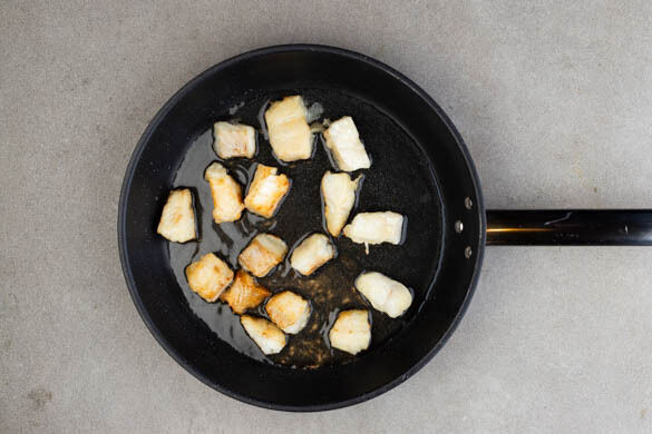 Den Fisch vorsichtig mit der Stärkemischung vermengen, bis er vollständig bedeckt ist. Den Fisch z. B. mithilfe einer Küchenzange oder Stäbchen etwas abtropfen lassen, dann ggf. portionsweise in das heiße Öl geben und in 3–5Min. goldbraun braten, dabei nach der Hälfte der Zeit wenden. Auf etwas Küchenkrepp abtropfen lassen.