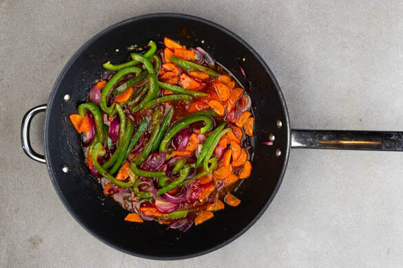 Die Zwiebeln und die Karotten in einer zweiten Pfanne mit 4EL des Fisch-Bratöls bei mittlerer Hitze ca. 5Min. braten. Inzwischen die Paprika vierteln, entkernen und in dünne Streifen schneiden. Den Ingwer schälen und fein reiben. Die Paprika, den Ingwer und 2EL Wasser in die Pfanne geben und 5–7Min. weiter braten, bis das Gemüse sehr weich ist.
