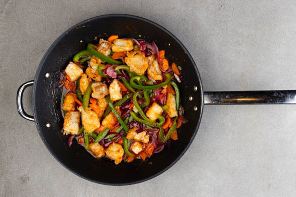 Den Fisch in die Pfanne geben und vorsichtig mit dem Gemüse vermengen, bis alle Fischstücke von Sauce bedeckt sind. Nach Geschmack mit Pfeffer nachwürzen. Den Fisch und das Gemüse sofort mit dem Reis anrichten und mit dem Koriander garniert servieren.
