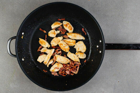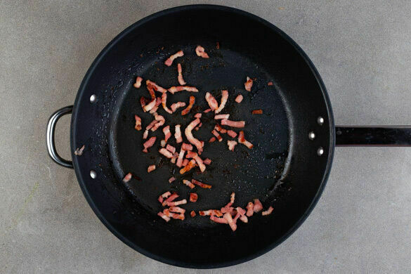 Den Speck in einer großen Pfanne mit 1EL Pflanzenöl bei mittlerer bis starker Hitze 3–4Min. anbraten.