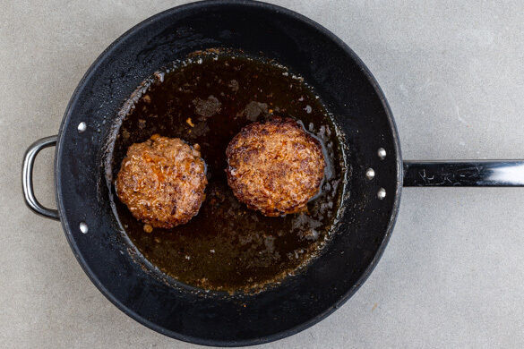 Die Pattys in einer mittelgroßen Pfanne mit 1EL Olivenöl bei mittlerer bis starker Hitze auf jeder Seite ca. 3Min. braten, bis das Fleisch durch ist. Die Burgerbrötchen aufschneiden, die Hälften wieder aufeinanderlegen und im Ofen ca. 3Min. aufbacken.