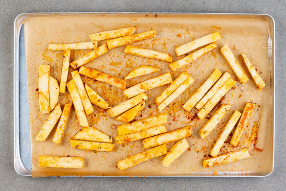 Den Backofen auf 240°C (220°C Umluft) vorheizen. Den Knollensellerie schälen und erst in ca. 1cm dicke Scheiben, dann in ca. 1cm breite Stifte schneiden. Auf einem mit Backpapier ausgelegten Backblech mit 1EL Olivenöl und der ½ der Gewürzmischung vermengen, dann 20–25Min. im Ofen backen.