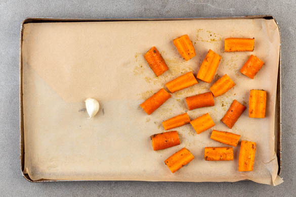 Den Backofen auf 240°C (220°C Umluft) vorheizen. Die Karotten ggf. schälen, längs halbieren und in ca. 5cm lange Stücke schneiden. Auf einem mit Backpapier ausgelegten Backblech mit 1EL Olivenöl, dem Kreuzkümmel-Koriander-Gewürz und ½TL Salz vermengen und gleichmäßig verteilen. Den ungeschälten Knoblauch dazulegen und die Karotten 18–22Min. backen, bis sie gar sind.