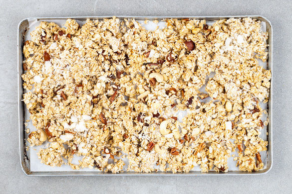 Das Granola 15–18Min. im Ofen backen. Nach der Hälfte der Zeit einmal durchrühren und wieder gleichmäßig verteilen, dann weiterbacken. Vor dem Servieren vollständig auskühlen lassen. Diese Menge reicht für 8 Portionen. Das Granola kann luftdicht verpackt bis zu 2 Wochen aufbewahrt werden. Am besten mit Joghurt oder Milch und frischem Obst genießen!