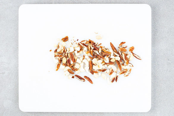 Den Backofen auf 180°C Umluft (200°C Ober-/Unterhitze) vorheizen. Die Cashews und die Pekannüsse grob hacken.